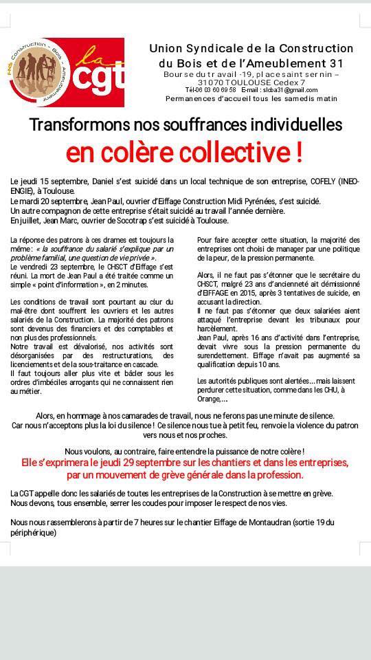 Le mardi 20 septembre, Jean Paul, ouvrier d’Eiffage Construction Midi Pyrénées, s’est suicidé.