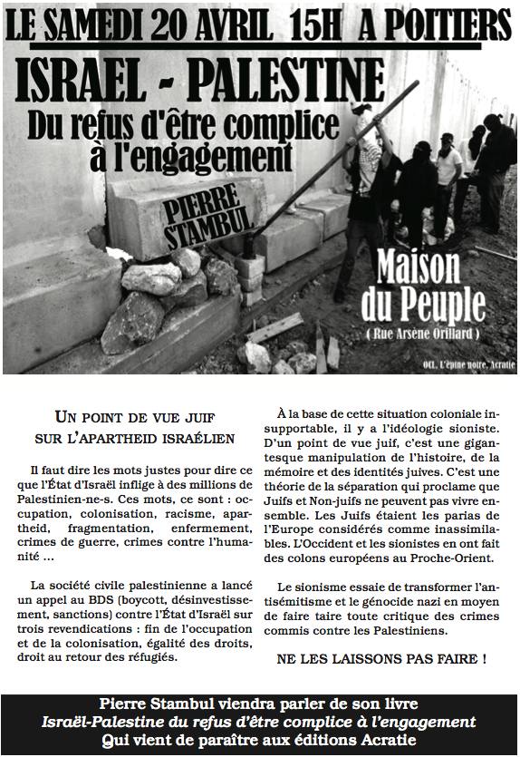 [1] Pierre Stambul, Israël/Palestine. Du refus d’être complice à l’engagement, Acratie 2012.